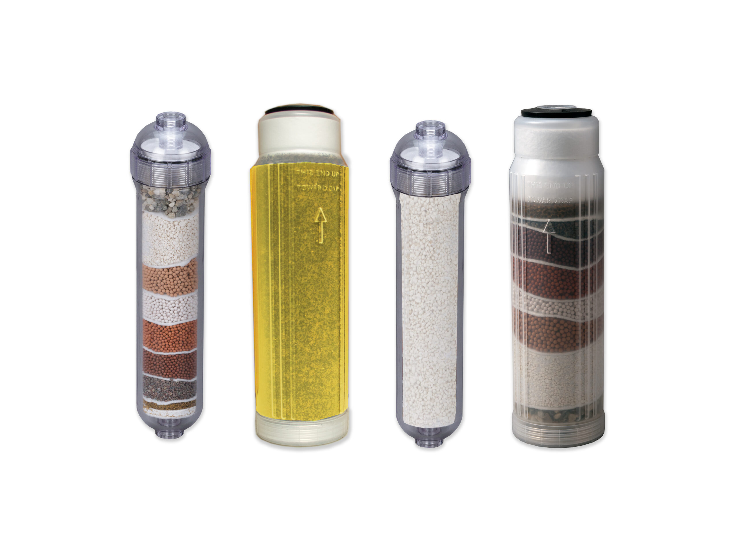 Alkaline Filters—Create mineralized alkaline drinking water with our nine stage filter that infuses minerals and ions into RO water. Raises the pH to ≈8.5-9.5.